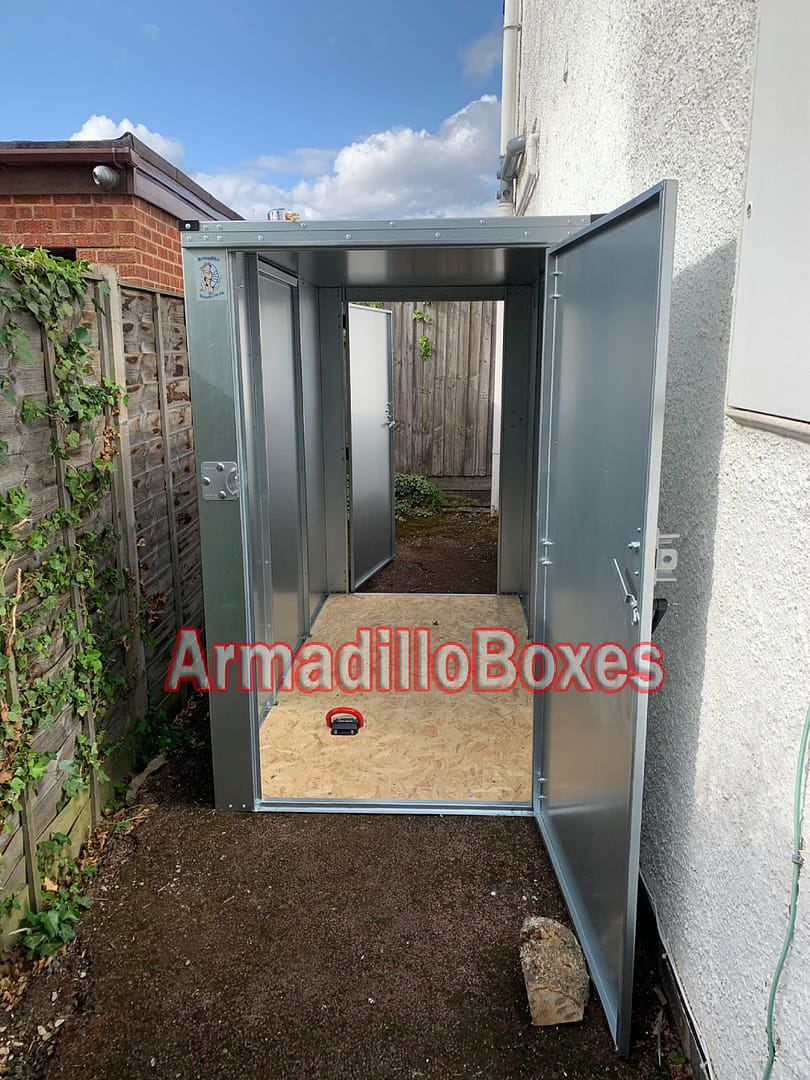 Welcome to the heavy weight division with our smallest units weighing over 34 stone made from 1.2mm galvanised steel nearly 3 times thicker than the plastic coated ones enabling us to use the heaviest locks, no amount of wind is going to put our units in a tree so strong they will stand on gravel or grass